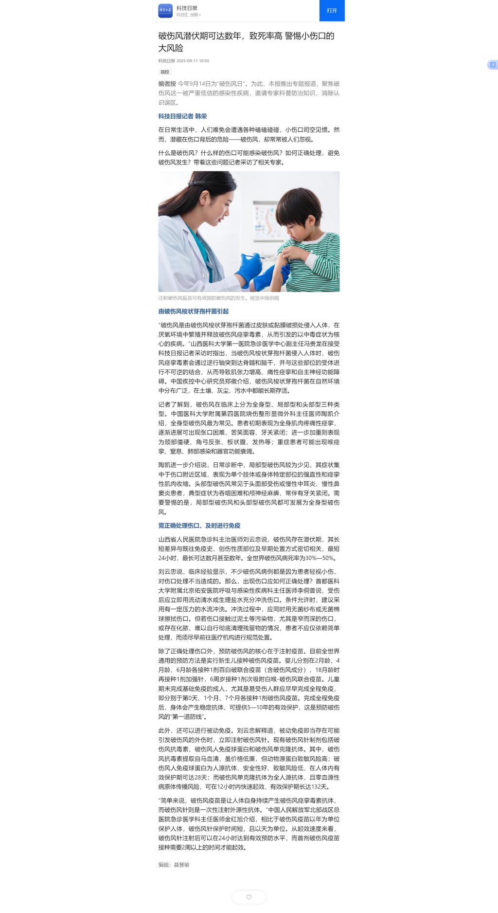 [科技日报]破伤风潜伏期可达数年,致死率高 警惕小伤口的大风险