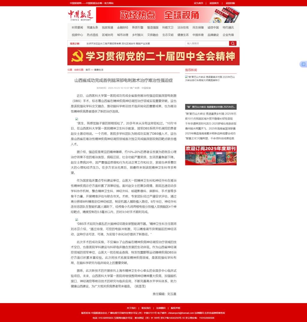 中国报道网|山西省成功完成首例脑深部电刺激术治疗难治性强迫症