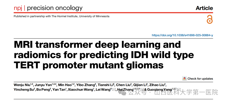 近日,山西医科大学第一医院核磁影像科张辉教授团队在Nature旗下子刊《npj Precision Oncology》杂志发表了题为“MRI transformer deep learning and radiomics for predicting IDH wild type TERT promoter mutant gliomas”的最新研究成果。山西医科大学医学影像学院本科生牛文举为第一作者,硕士研究生闫俊羽、郝敏等为共同作者,山医大一院张辉教授、杨国强副教授和首都医科大学附属北京天坛医院王磊主任医师担任共同通讯作者。