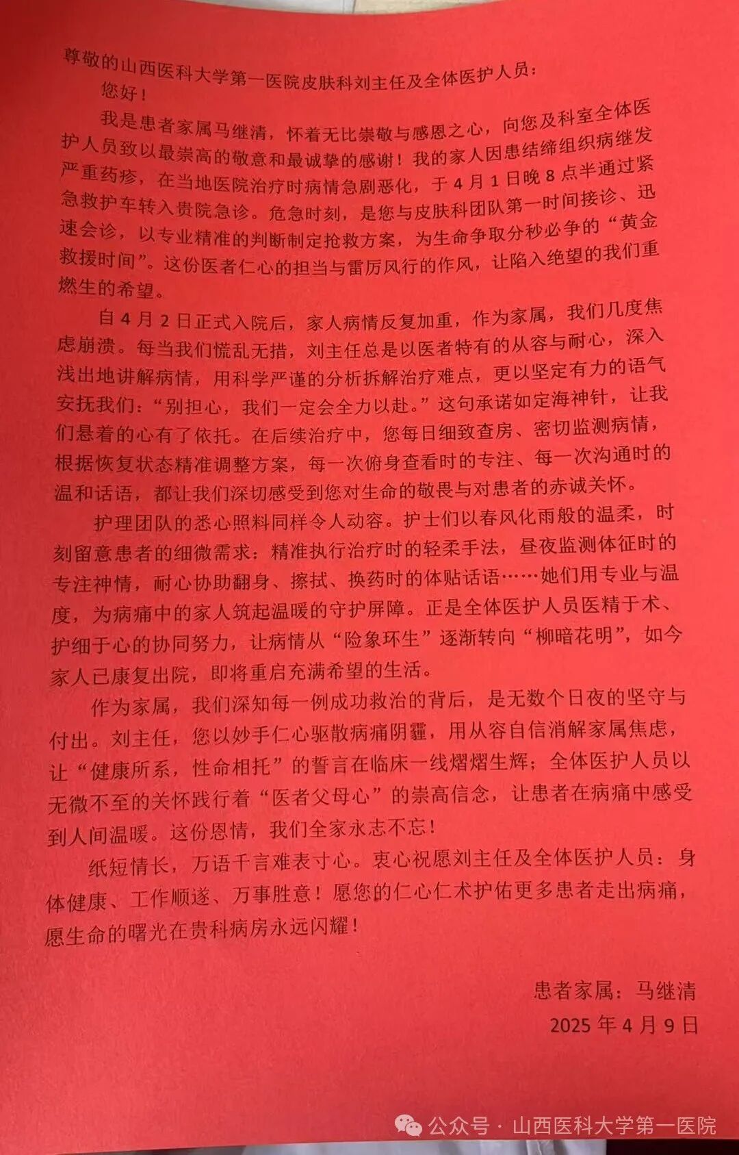 4月11日,山西医科大学第一医院皮肤科病房内温情涌动,一位曾命悬一线的重症药疹患者王女士及其家属将一面“胸有乾坤稳解沉疴险,心含仁爱细护康复程”的锦旗和一封饱含深情的表扬信,郑重地送到皮肤科医护团队手中,以感谢在生死关头全力以赴、创造生命奇迹的大爱之举。