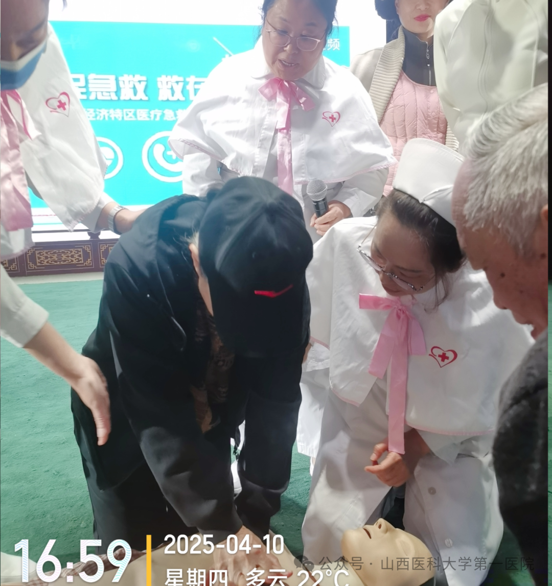 眼科李婷主管护师以“青少年近视相关知识”为题,从正确认识近视、如何正确矫正视力、如何爱眼护眼等几方面进行了讲解;白丽莉副主任护师分享了“如何正确拨打120”“正确掌握心肺复苏的重要性”,旨在告知大家如何自救、他救,学会“就近、就急、就水平”急救原则,正确掌握救护新概念,知晓心肺复苏术重要性,了解AED使用方法。志愿者们对现场人员进行了一对一心肺复苏指导,并对大家提出的就医问题提供了专业建议。活动持续近两小时,共计为60余人进行了科普宣传。
