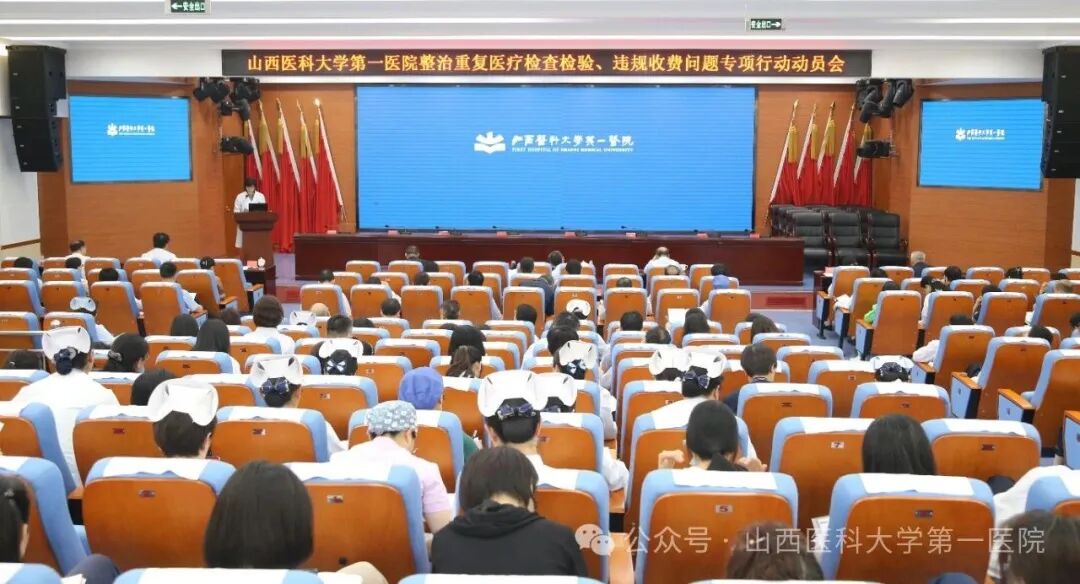 为深入贯彻落实国家及山西省卫生健康委关于规范医疗行为、改善人民群众就医体验的部署要求,4月29日,山西医科大学第一医院在护校六层多功能报告厅召开整治重复医疗检查检验、违规收费问题专项行动动员会。党委书记徐钧讲话,党委副书记、院长周芸主持,党委委员、副院长贾红燕传达上级会议精神。院领导班子全体成员及各党支部书记,各科室主任、副主任、护士长等参加会议。