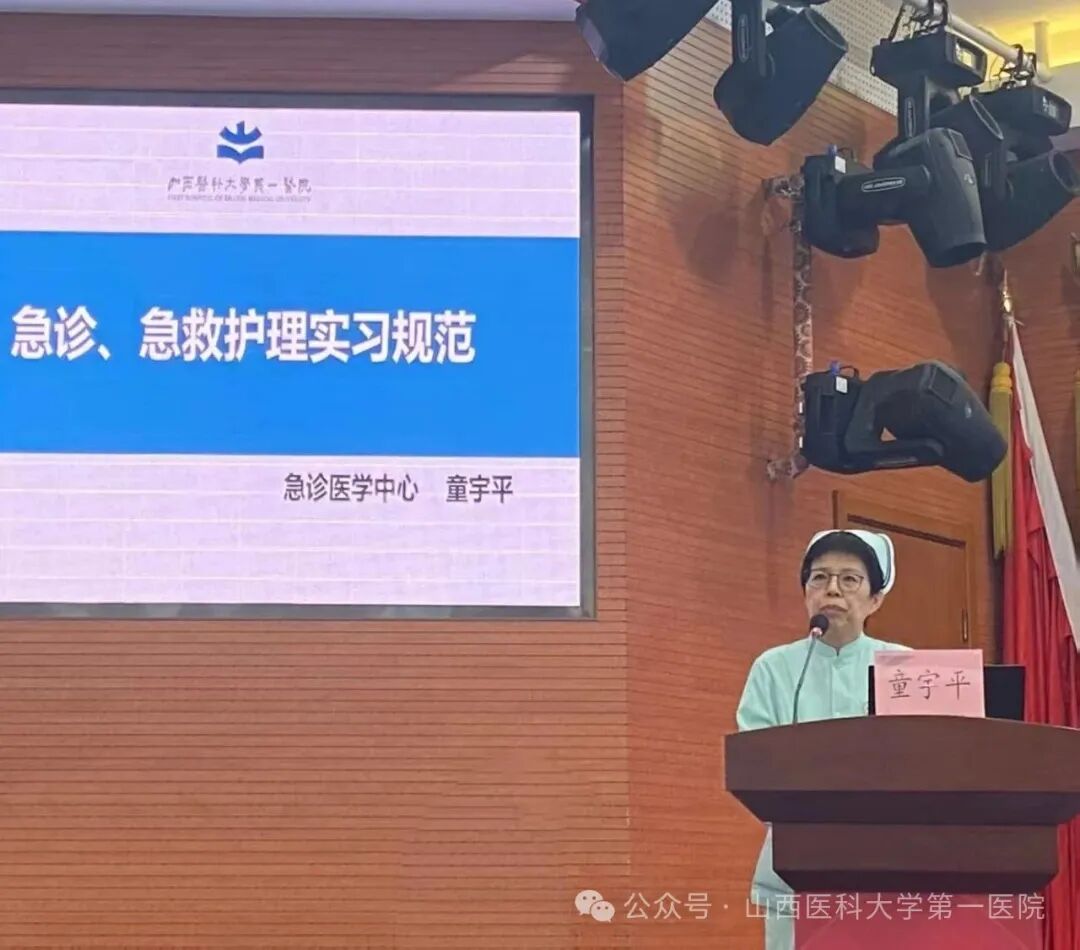 随后,培训课程在护理部主任商临萍的“医院及护理介绍”专题授课中拉开序幕。本次培训围绕职业素养、人文沟通与临床实践展开,护理部李育玲、李莉、唐珊解读了实习管理及规范、优质护理实践、患者安全核心制度,为实习管理筑牢规范基础。门诊部魏绍辉分享了“志愿+医疗”服务创新模式,为实习生打开多维服务视角。住院部弓玉红、新生儿重症科张惠蓉分别从住院服务优化、护士礼仪规范等维度,强化了职业行为标准。血管外科梁芳以“护患沟通方法和技巧”为切入点,通过案例教学解析临床沟通策略;精神卫生科李素萍聚焦“综合医院心理护理”,结合护士心理健康维护,引导实习生建立身心双重管理。急诊医学中心童宇平、心血管内科杨丽洁、重症医学科赵文芳等临床专家通过急救规范、教学查房、危重症患者护理等实操课程,提升了实习生岗位胜任力;感染管理科潘玮以“医院感染管理与职业防护”为题为实习生筑牢安全防线。