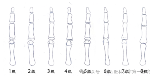 Sanders与同事在2008年发表了以Tanner- Whitehouse法为基础的评估骨骼成熟度的简便方法,具有易于使用并能可靠预测侧凸进展的优点。该方法将骨骼从幼稚到发育成熟的过程分为1-8级。青少年快速生长期(3级或4级)可以用指骨末梢的闭合来区别。该方法的可靠性较高,而且测试者对方法熟悉后很容易使用。图2-25显示Sanders骨骼成熟度分级,1级:幼年期,指骨骨骺未覆盖;2级:青春期前,所有指骨骨骺被覆盖(Tanner 分级2级);3级:青春期加速早期(Tanner分级2-3级),生长高峰期,任何远端指骨骨骺明显地开始闭合;4级:青春期加速晚期(Tanner分级3级,Risser征0级,Y软骨开放)任何远端指骨骨骺明显地开始闭合;5级:青春期稳定早期(Risserc征0)级,Y软骨闭合)中节指骨或近指骨骨骺闭合;6级:青春期稳定晚期(Risser征>0级);7级:成熟期早期;8级:成熟期,远侧桡骨骨骺完全闭合。