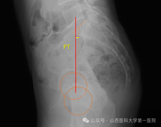 骨盆倾斜定义为骶骨上终板中点与双侧股骨头中心连线中点的连线与铅锤线之间的夹角。PT是一个骨盆位置参数,描述的是骨盆的旋转情况,反映代偿机制,PT的正常值<20°,PT值增大,重力线扭矩增大,肌肉耗能增加。当骨盆后倾时,PT增大,随着PT的增加,腰椎变得后凸,伤残和疼痛变得越严重。PT值越大,理论上骨盆对矢状位失衡的代偿能力越强。