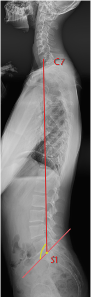 从S1上缘中点垂直于地面绘制的垂线,它描绘了脊柱相对于骨盆的冠状位置。
