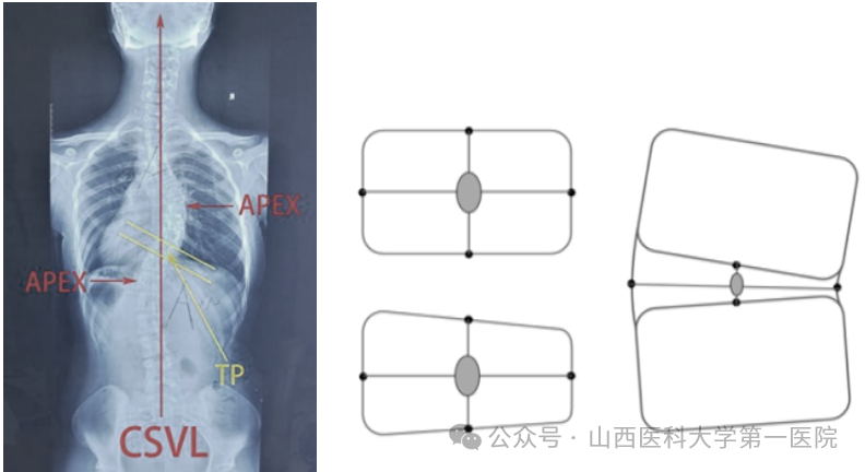 顶椎是评估脊柱畸形的常用指标,对手术策略制定具有重要指导意义,具有如下特点:顶椎是偏离骶骨中垂线(CSVL)最远的椎体;顶椎可以是椎体也可以是椎间盘;顶椎在横断面上旋转程度最大。