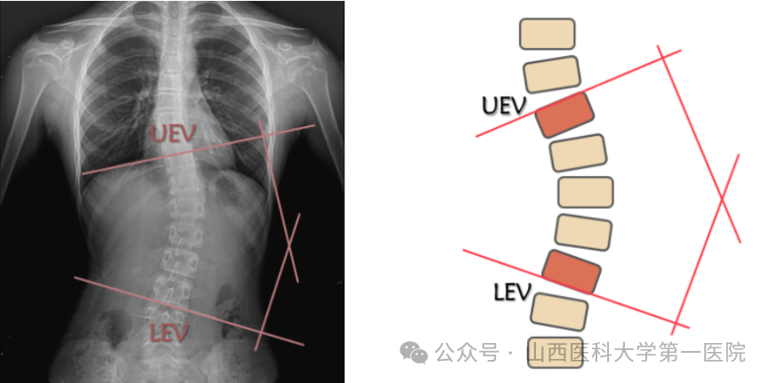 沿上端椎的上终板(UEV)和下端椎的下终板(LEV)各画一条直线,分别做这两条直线的垂线,两垂直线的交角即为侧凸Cobb角。脊柱侧凸研究学会(The Scoliosis Research Society,SRS)建议,当Cobb角大于或等于10°并伴有椎体轴向旋转,即可明确诊断脊柱侧弯。