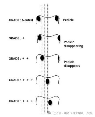 Nash-Moe方法将椎体旋转分为五级。在该方法中,椎体先被纵向一分为二,然后每一半椎体再被分成三等份。如果椎弓根影与两侧椎体边缘等距,则说明椎体没有明显旋转,即Nash-Moe为0级。而1级旋转时,大部分凸侧椎弓根仍然在边缘1/3区域内,而凹侧椎弓根已逐渐消失。2级旋转时,凸侧椎弓根影落在中间1/3区域内,而凹侧椎弓根影可能已消失。3级旋转时凸侧椎弓根影落在靠近中线的1/3区域内,此时凹侧椎弓根影已不可见。4级旋转时,凸侧椎弓根已超过中线而凹侧椎弓根仍不可见。最近也有研究肯定了Nash-Moe方法的准确性,可以用于评价脊柱旋转。